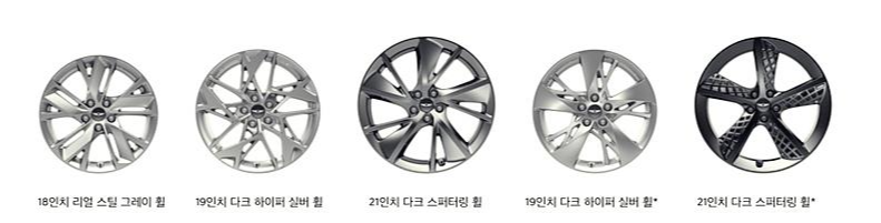 차량에서 마니아층이 가장 중요시 보게 되는 것은 바로 휠 디자인이라고 생각되는데요. 제네시스 GV70의 휠 디자인은 5가지 구성을 가지고 나왔어요. 18인치, 19인치=2개, 21인치=2개 이렇게 구성하고 있는데요. 18인치부터 시작하는 휠이라서 모두 디자인이 멋지게 나온 것 같아요. 특히, 21인치 다크 스퍼터링 휠의 경우 개인적으로 가장 매력적인 휠이 되지 않을까 생각되네요.