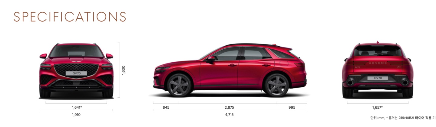 차량의 크기 제원은 전장 4715mm / 전폭 1910mm / 전고 1630mm, 휠베이스 2875mm의 크기를 가지고 있으며, 후륜구동을 기반으로 하는 제네시스의 프리미엄 중형 SUV 모델입니다.