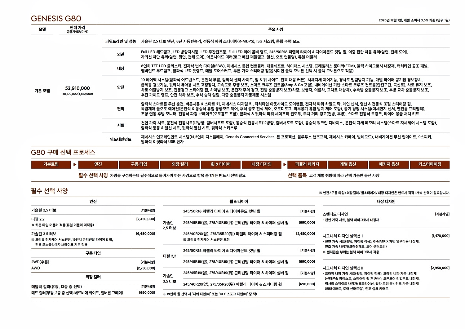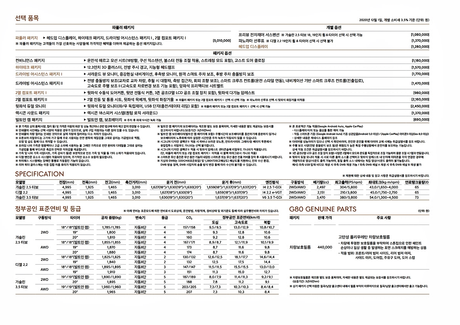 제네시스 G80 가격표 (2020년 12월 자료)