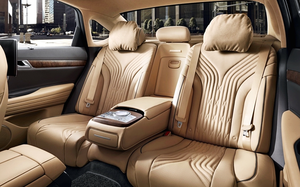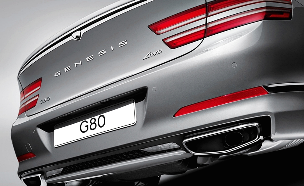 후면부에서도 램프의 디자인이 돋보이는데요. 테일램프의 경우 전면과 동일한 느낌을 주는 쿼드 램프 스타일의 램프가 적용되면서 전면과 후면의 조화를 이루는데 큰 역할을 하고 있습니다. 머플러의 경우 크레스트 그릴 스타일의 방패 모형 머플러가 적용되어 제네시스 브랜드의 고급스러운 느낌을 잘 전달해주고 있습니다.