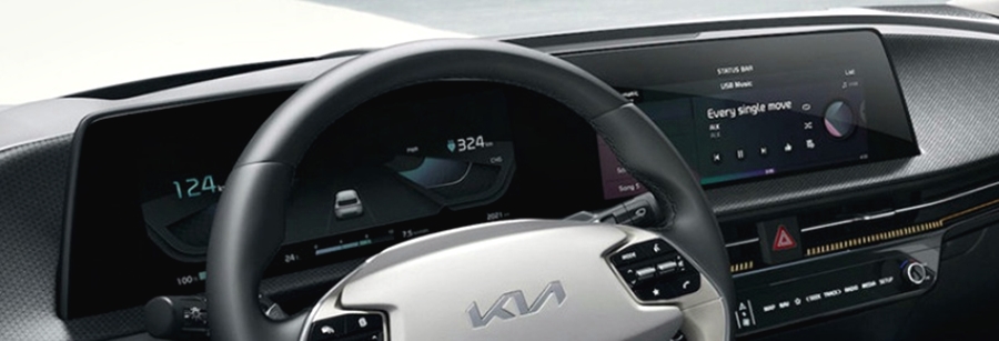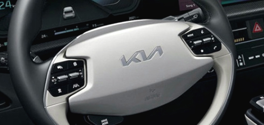 스티어링 휠에 기아의 새로운 엠블럼이 적용되어 더욱 심플하며 고급스러운 느낌을 줍니다. 스티어링 휠 리모컨 다이얼도 간소화하면서 더욱 편리한 전기자동차라는 것을 부각해줬습니다.