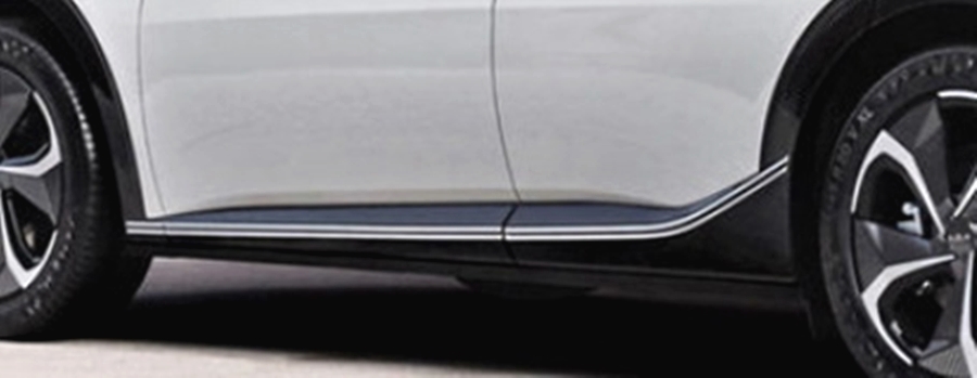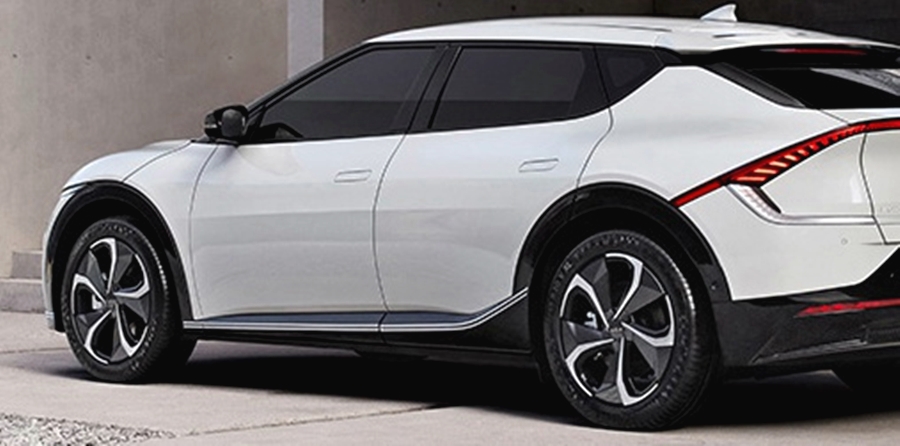 측면부 디자인은 A필러 라인에 플라스틱 소재로 기아에서 사용하는 방식으로 루프가 강조된 느낌의 디자인을 가지고 있으며, 루프는 후면으로 갈수록 낮아지고, 측면의 벨트라인은 높아지면서 현대 아이오닉 5 보다 더욱 스포티한 느낌의 차량이라는 것을 알 수 있습니다.