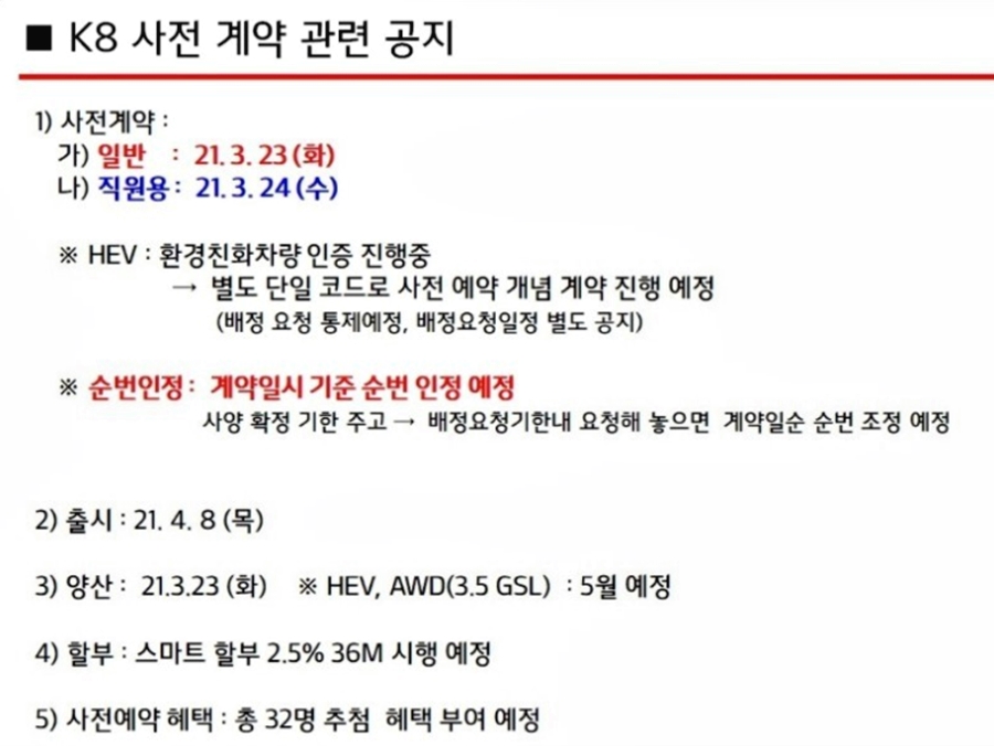 기아 K8의 사전계약 일정은 3월 23일 화요일인데요. 사전계약 순번은 계약일시 기준으로 순번이 인정될 예정이기 때문에 차량의 모든 옵션을 선택한 후 사전예약을 학 ㅣ보다는 빠르게 사전계약을 진행하는 게 오움이 될 것 같습니다.