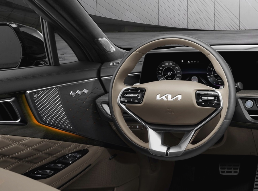 기아 K8의 실내 인테리어는 심플하면서도 미래지향적인 느낌으로 제작이 되었는데요. 파노라마 커브드 디스플레이를 적용한 기아의 최초 자동차가 되었습니다. 프리미엄을 지향하는 메르디안 프리미엄 사운드 시스템을 적용하여 차량의 감성을 더욱 자극시켰으며, 브랜드 최초로 알루미늄 소재의 신규 엠블럼이 적용되었는데, 이는 기아의 새로운 시대를 여는 첫 번째 모델로 의미하는 바가 큰 것 같습니다.