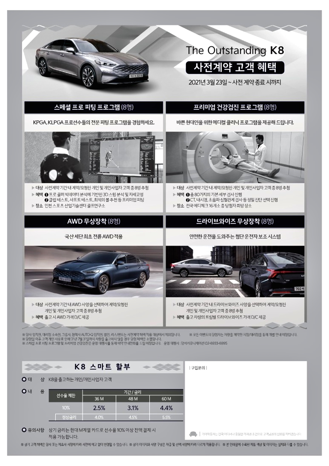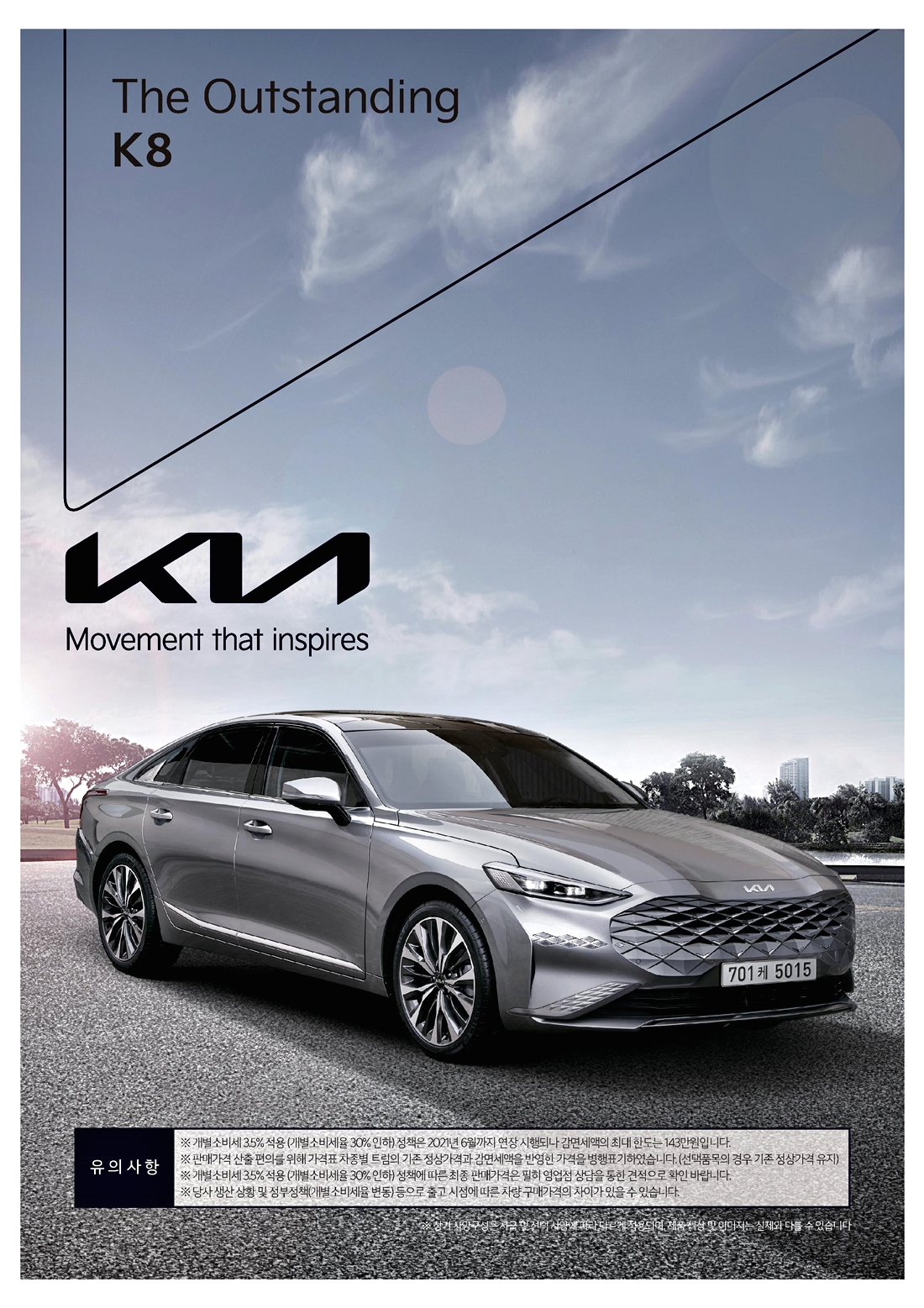 기아자동차의 프리미엄 세단 K7의 후속 모델인 기아 K8의 사전계약을 실시했는데요. 기아자동차에서는 프리미엄 세단으로 약 10년 동안 활약을 펼쳤던 기아 K7의 차량 명을 변경하고 새롭게 기아 K8이라는 이름을 사용하여 오늘부터 사전계약에 들어갔습니다. 차량 출고는 4월 8일부터 시작하며, AWD 모델과 하이브리드 모델은 5월부터 본격적인 판매에 들어간다고 합니다.