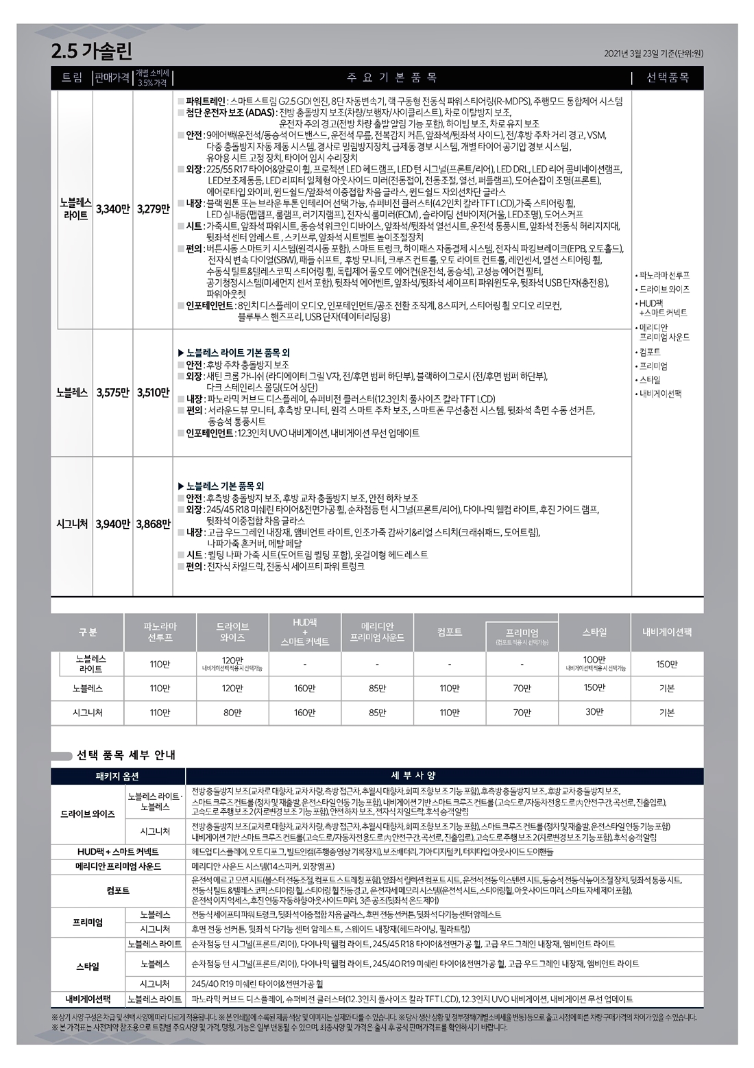 기아 K8은 총 3가지 등급으로 나눠지며, 기아 K8 2.5리터 가솔린은 노블레스 라이트(3340만 원), 노블레스(3575만 원), 시그니처(3940만 원)로 책정되었습니다. 더욱 자세한 기아 K8의 가격은 아래의 기아 K8 가격표를 참고하시면 도움이 될 것 같습니다.
