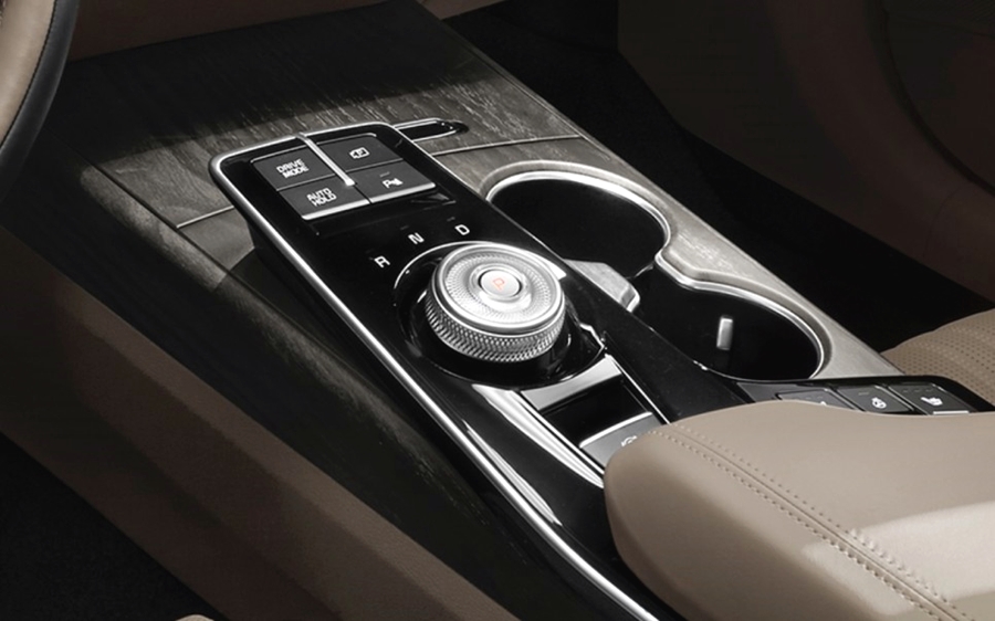센터 터널의 경우 전자식 변속기가 적용되었는데요. 최근 출시되는 기아의 다이얼 형태를 가지고 있지만, 기아 K8의 다이얼 형태는 다른 모습인데요. 운전자의 편의성을 위해 운전자 방향으로 휘어져 있다는 것이 특징입니다. 살짝 경사가 있는 스타일로 그립감을 더욱 좋게 만들었습니다.