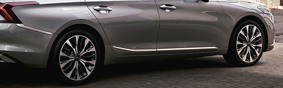 기아 K8 측면부 디자인은 5M가 넘는 긴 전장을 토대로 더욱 슬림하면서도 웅장한 느낌을 주고 있습니다. 프리미엄 세단으로 비율이 상당히 좋습니다. 하단의 크롬은 전면에서 시작해서 사이드 그리고 테일램프로 이어지는 독특한 디자인으로 기아 전기자동차 EV6에 들어갔던 방식으로 제작이 되었습니다. 이는 기아자동차의 독창적인 아이디어가 반영된 디자인으로 앞으로 기아의 아이덴티티 디자인이 되지 않을까 싶습니다.