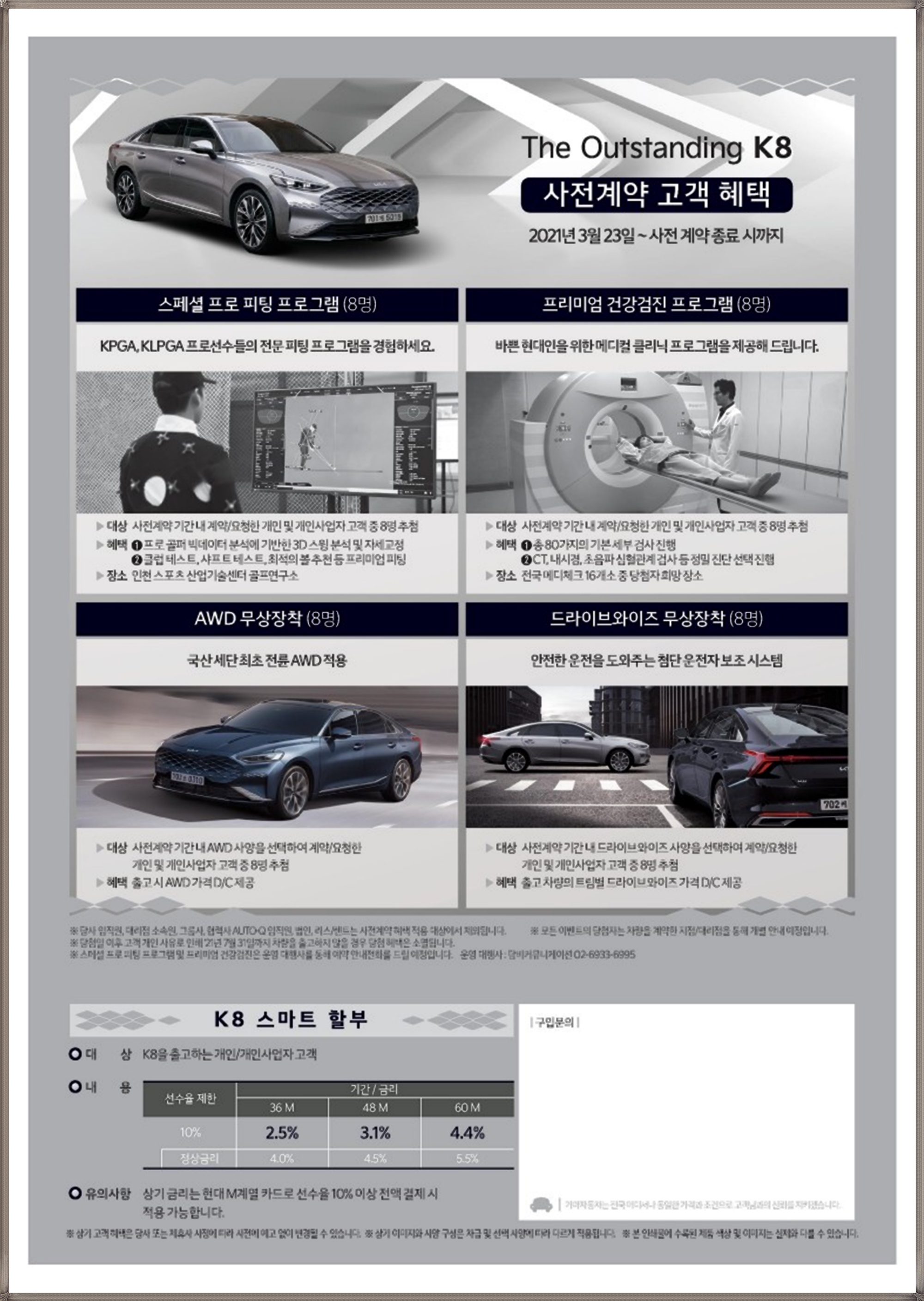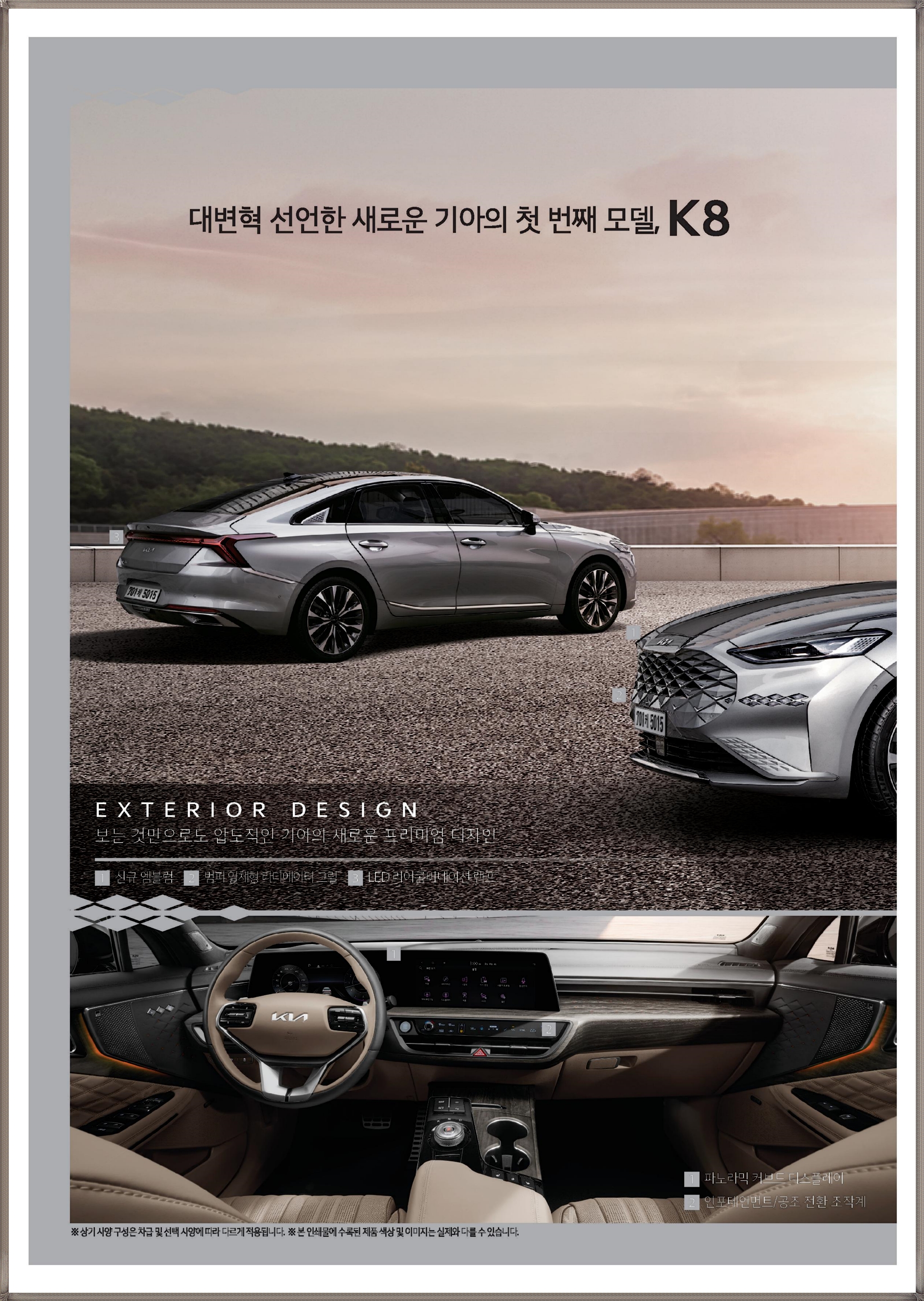 기아 K8은 국내 준대형 세단 최초로 전륜 기반의 AWD를 적용하여 강력한 동력성능을 바탕으로 안정적인 주행 능력과 성숙성 그리고 편안한 승차감으로 준대형 세단의 라이벌 현대자동차 그랜저를 뛰어넘을 준비를 하고 있습니다.