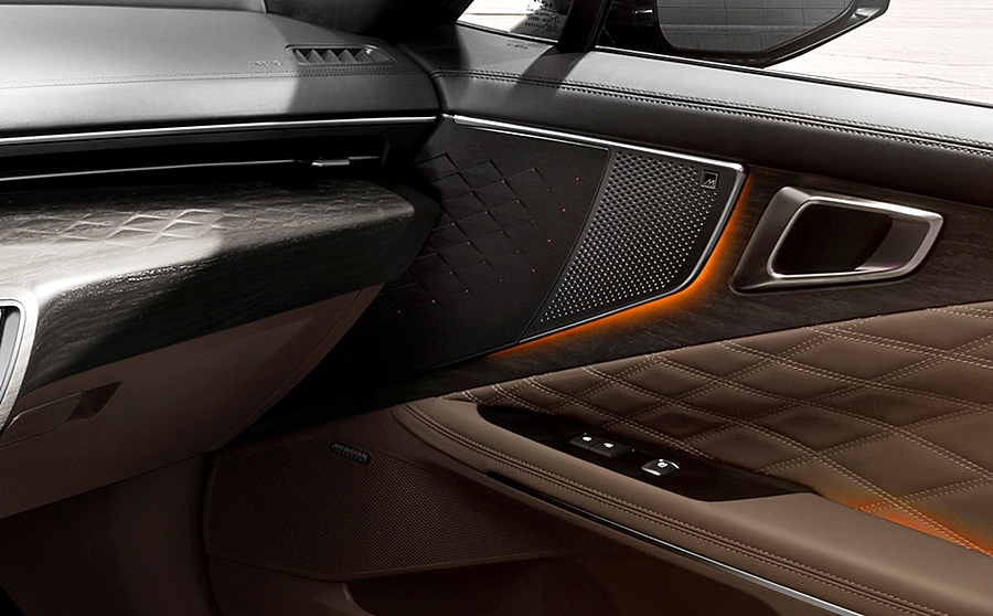 기아 K8에는 감성을 울리는 영국의 대표 하이엔드 오디오 시스템 브랜드인 메리디안의 프리미엄 사운드가 기아 최초로 적용되어 더욱 큰 관심을 받고 있으며, 곳곳에 엠비언트 라이트를 통해 차량의 고급스러운 느낌과 동시에 즐거운 드라이브를 도와주는 역할을 하고 있습니다.