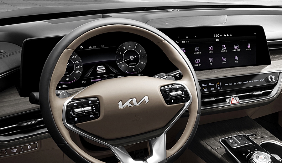 기아 K8의 실내는 모든 승객이 편안하게 이동할 수 있는 쾌적하고 다양한 고급사양이 적용되었습니다. 가장 눈에 띄는 부분은 전면부에 위치한 파노라믹 커브드 디스플레이라고 할 수 있는데요. 파노라믹 커브드 디스플레이의 경우 드라이브 별로 차별화된 디자인을 제공하는 12.3인치 클라스터와 캘린더 연동 일정 확인 및 출발 시간 알림, 차량 내 간편 결제 등을 지원하는 12.3인치 인포테인먼트 시스템으로 구성하고 있어 더욱 편리하고 시인성 높은 디스플레이를 구현하였습니다.