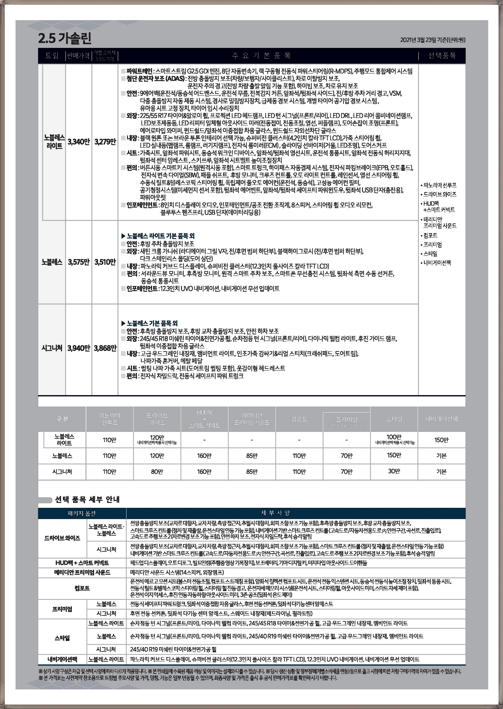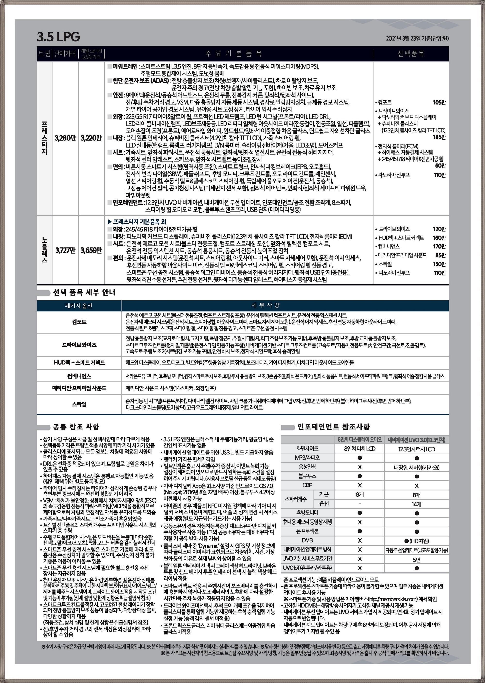 그리고 3.5리터 가솔린과 3.5리터 LPI 엔진의 경우 국내 최초로 투 챔버 토크 컨버터를 적용한 신규 자동 8단 변속기를 적용하여 성능과 효율성을 개선하였습니다. 또한, 상반기 중으로 1.6리터 가솔린 터보 하이브리드 모델을 추가할 계획을 가지고 있습니다.
