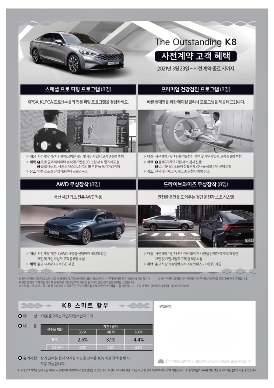 | 기아 K8 사전계약 혜택(가격표) (0) | 2021.04.05 |