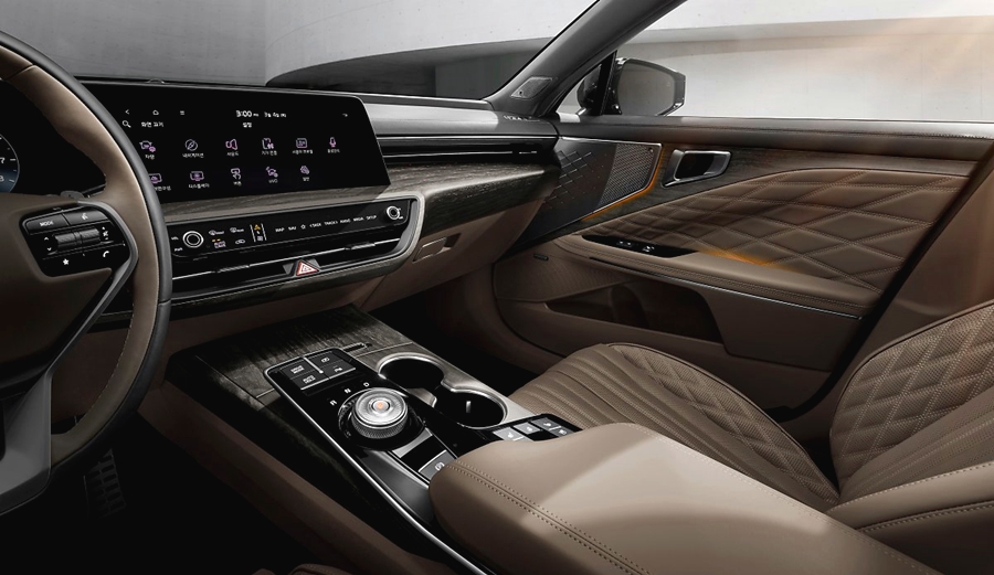 기아 K8 실내 인테리어는 심플하면서도 고급스러운 느낌으로 준대형 세단의 공간성과 편의성을 극대화시킨 모습을 가지고 있습니다. 스티어링 휠에는 기아의 심플한 엠블럼이 시선을 사로잡고 있으며, 기아 최초로 사용되는 파노라믹 커브드 디스플레이를 사용하고 있어 더욱 신비로운 느낌을 줍니다. 파노라믹 커브드 디스플레이는 12.3인치 클라스터와 12.3인치 인포테인먼트 시스템이 적용되어 더욱 높은 시인성을 자랑합니다.