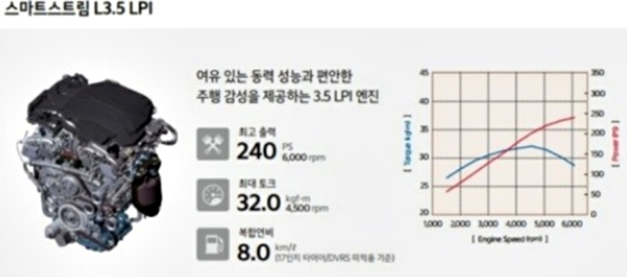 마지막으로 소개해 드릴 기아 K8 3.5리터 LPI 스마트스트림 엔진으로 여유 있는 동력 성능과 편안한 주행 감성을 제공해주고 있는 엔진으로 최고출력 240마력 / 최대토크 32.0kg.m의 성능을 보여주고 있으며, 복합연비 8.0km/l의 연료 효율성을 자랑합니다. 연료 효율성이 낮아 보이지만, LPG 연료가 저렴하기 때문에 연료 효율성을 정확히 계산하다면, 매우 효율적입니다. 이 엔진의 특징으로는 연비 주행 성능과 응답성을 개선한 전륜 8단 자동 변속기를 3.5리터 LPI 스마트 스트림 엔진까지 확대 적용하여 더욱 편안하고 안정적인 주행 감성을 구현하고 있습니다.
