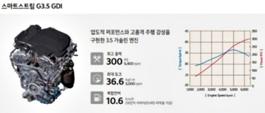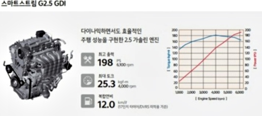 다음으로 보실 엔진은 2.5리터 GDI 스마트스트림 엔진으로 다이내믹한 주행 성능과 동시에 연료 효율성까지 동시에 가지고 있는 엔진으로 최고출력 198마력 / 최대토크 25.3kg.m의 성능을 보여주며, 복합연비는 12.0km/l의 연료 효율성을 가지고 있습니다. 이 엔진의 특징으로는 R-MDPS 시스템을 2.5리터 GDI 스마트스트림 엔진으로 확대 적용하면서 조향 안전성과 응답 성능을 강화했습니다.
