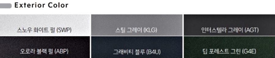 기아 K8의 외부 컬러로는 스노 화이트 펄, 스틸 그레이, 인터 스텔라 그레이, 오로라 블랙 펄, 그래비티 블루, 딥 포레스트 그린 컬러 총 6가지 컬러 구성을 가지고 있습니다.