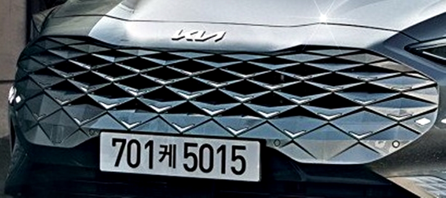 전면부 그릴에는 기아의 전형적인 아이덴티티가 담겨 있는 타이거 노즈 그릴이 자리하고 있습니다. 이는 호랑이의 코를 닮았기 때문에 타이거 노즈 그릴이라고 불리는데요. 이번에는 신기하게 타이거 노즈 그릴 테두리에 크롬이나 다른 형태의 무엇이 빠진 느낌이죠? 이는 전기자동차와 미래 지향적인 디자인이라는 생각이 듭니다. 기아 K8에서는 타이거 노즈 그릴의 경계가 없는 일체형 범퍼를 사용하고 있습니다.