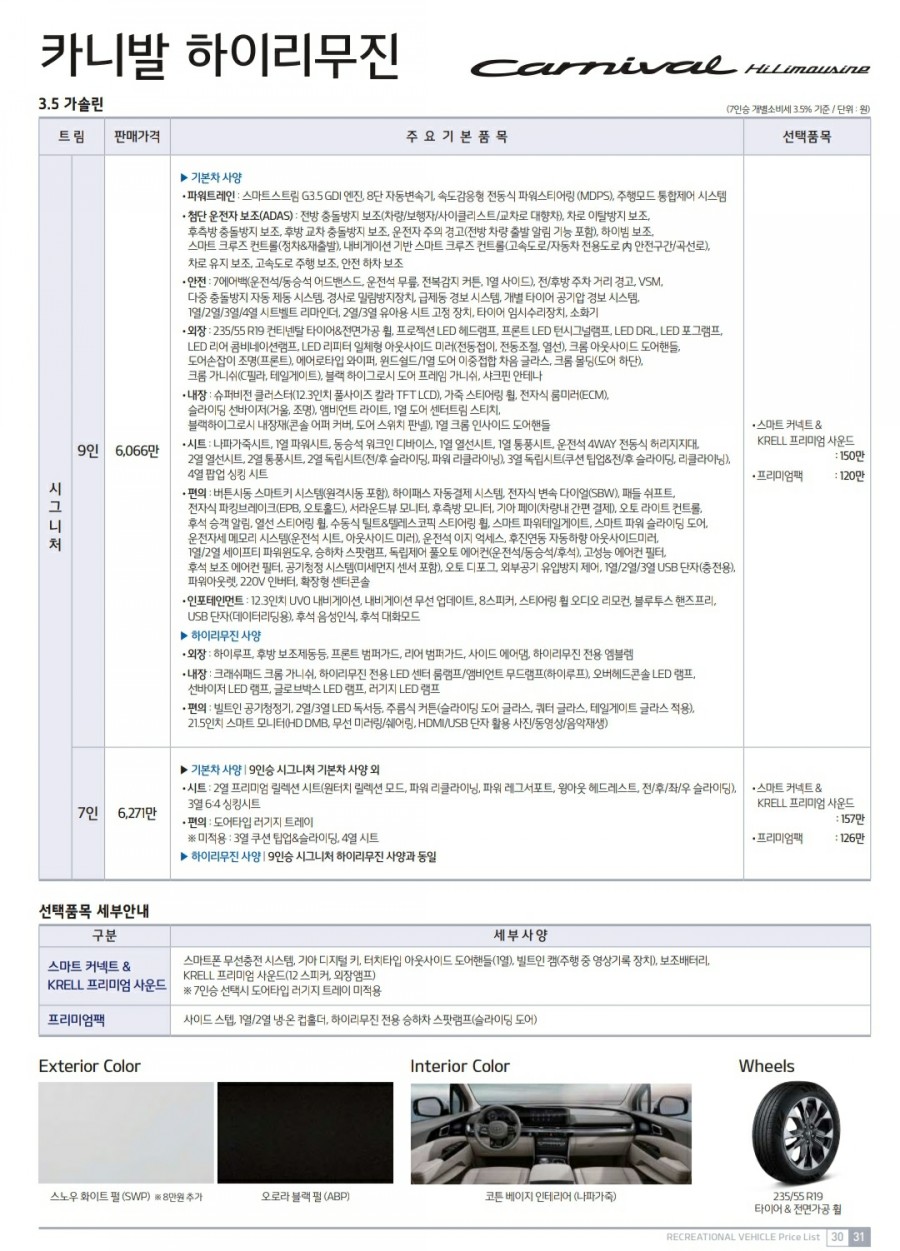 기아 카니발 하이리무진 옵션으로는 외관에서는 차음 유리, 아웃사이드 미러, 리어 램프, 데일 라이트, 안개등, 오토 하이빔, 오토 라이트 컨트롤, LED 헤드램프 등이 적용되며, 실내에서는 디지털 계기판, 안드로이드 오토, 애플 카플레이, 블루투스 연결!