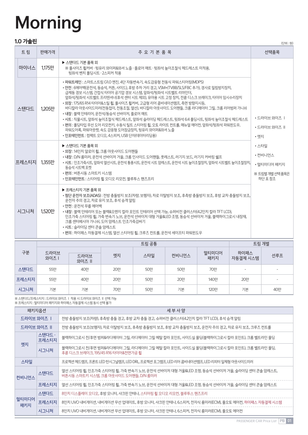 기아 더 2022 모닝의 판매 가격으로는 스탠더드 1205만 원 / 프레스티지 1355만 원 / 시그니처 1520만 원으로 책정이 되었습니다. 자세한 가격은 아래 기아 더 2022 모닝 가격표를 참고해주세요.