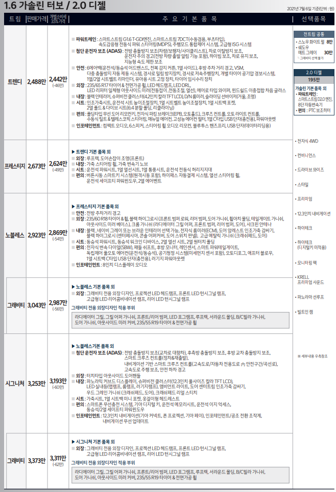 기아 스포티지 풀체인지 모델의 사전계약 판매 가격은 1.6 터보 가솔린 2442~3193만 원 / 2.0 디젤 2634만 원~3385만 원으로 책정이 되었는데요. 1.6 가솔린 터보 하이브리드 모델의 경우 추후 공개가 될 예정이라고 하네요. 나중에 하이브리드도 공개되면 포스팅 올릴게요. 그리고 스포티지 가격표 사전계약용의 자세한 가격표는 아래를 확인해주세요.