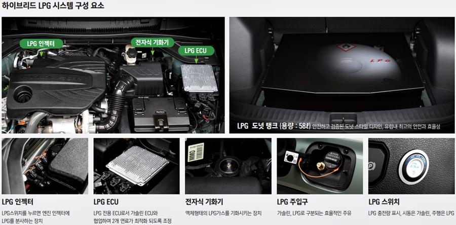 휘발유의 경우 50리터를 확보하였고, LPG는 58리터를 확보하고 있어요. LPG 탱크 용량이 58리터이지만, 법규상 전체 용량의 80%만 충전이 가능하기 때문에 약 46리터 까지 충전이 가능한 것으로 보이네요.