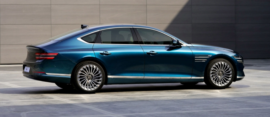 차량의 밑에 배터리를 위치하기 때문에 기존 G80 모델 보다 차고를 1CM 높인 것으로 보이는데, 차량의 디자인에는 큰 손실 없이 잘 만들어진 것 같습니다. C필러의 날렵하게 떨어지는 쿠페라인과 비슷한 디자인은 스포티한 느낌을 물씬 느끼게 해 주네요. 전체적으로 우아함이 넘치는 역동적인 세단의 이미지를 가지고 있어 고급스러운 전기자동차의 느낌을 보여주고 있습니다.