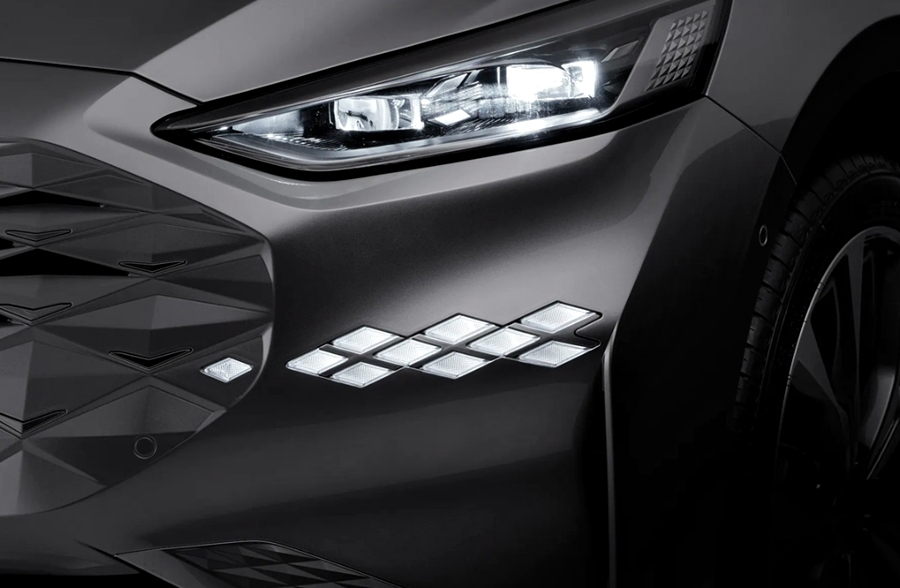 굴곡이 느껴지는 후드 라인을 가지고 있으며, 그릴 상단 양쪽으로는 헤드램프가 얇게 디자인되었는데, 마치 날렵한 눈을 연상시키는 것 같아 스포티한 느낌을 주고 있어요. 그릴 양쪽으로는 주간주행등과 방향지시등 역할을 하는 스타 클라우드 라이팅을 적용하였는데요.