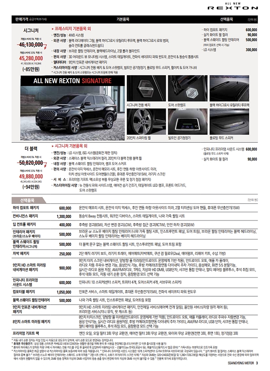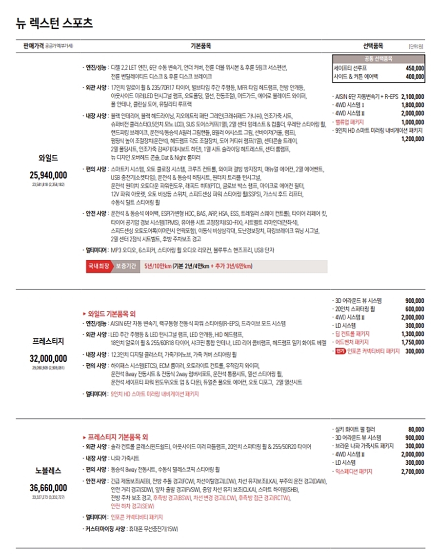 2023 렉스턴 가격표 렉스턴 스포츠 및 렉스턴 스포츠 칸 포함