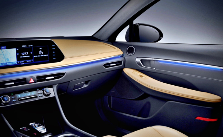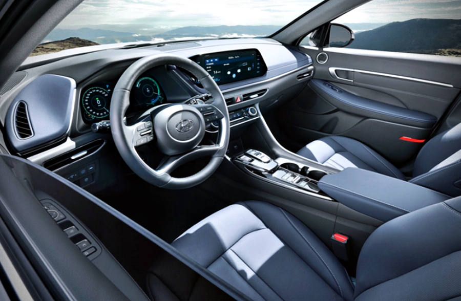 쏘나타 하이브리드의 실내 인테리어는 국민 차량답게 군더더기 없는 모습을 보여주고 있어요. 깔끔한 디지털 계기판과 와이드 한 인토테인먼트 스크린 그리고 각종 선이 살아있는 수평적인 디자인은 차량을 더욱 넓어 보이는 효과를 주고 있어요.