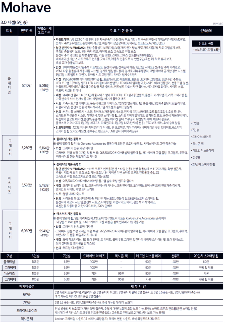 2024 모하비의 판매가격은 5016만 원~5949만 원으로 책정이 되었어요. 3.0 단일 파워트레인과 4륜구동이 모두 적용되어 가격의 폭이 넓지 않아서 선택하기 편해졌네요. 자세한 가격은 아래의 2024년형 모하비 가격표를 참고해 주세요.