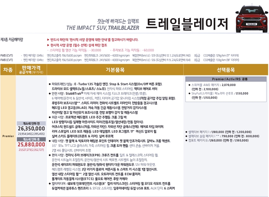 2023년형 쉐보레 트레일 블레이저의 판매가격은 2489만 원~2897만 원으로 책정이 되었는데요. 자세한 가격은 아래의 2023 트레일 블레이저 모델 가격표를 참고하시면 도움이 될 것 같네요.