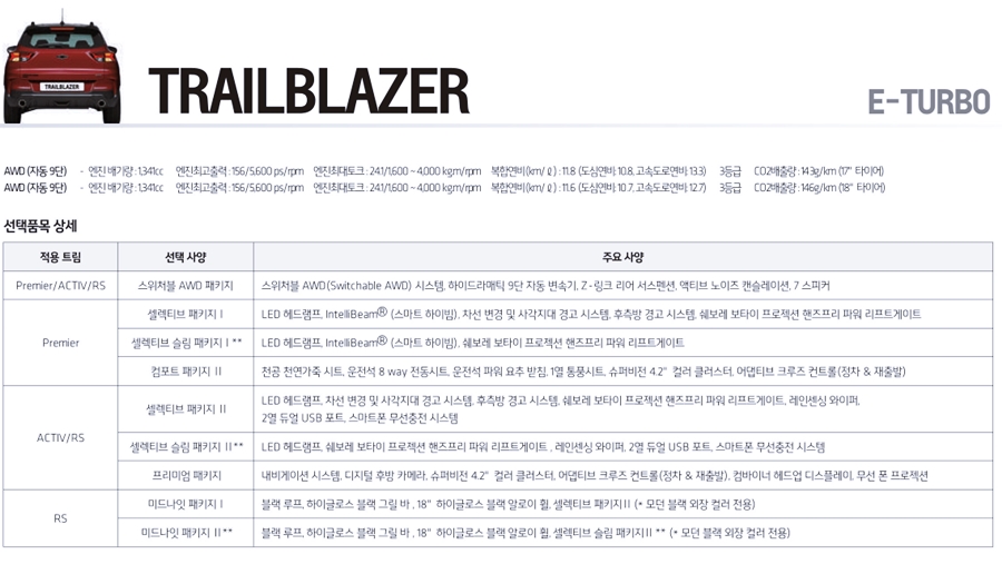 쉐보레 트레일 블레이저의 파워트레인은 1.35리터 3 기통 싱글 터보 가솔린 엔진과 CVT 변속기의 조합으로 최고출력 156마력 / 최대토크 24.1kg.m의 성능을 발휘해요. 복합연비는 12.6~12.9km/l의 연료 효율성을 가지고 있어요. 차량의 무게를 측정하는 공차중량은 1345~1365kg의 무게를 가지고 있어요. 전륜 서스펜션은 맥퍼슨 스트럿 서스펜션이 적용되었고, 후륜에는 토션 빔 서스펜션이 적용되었어요.