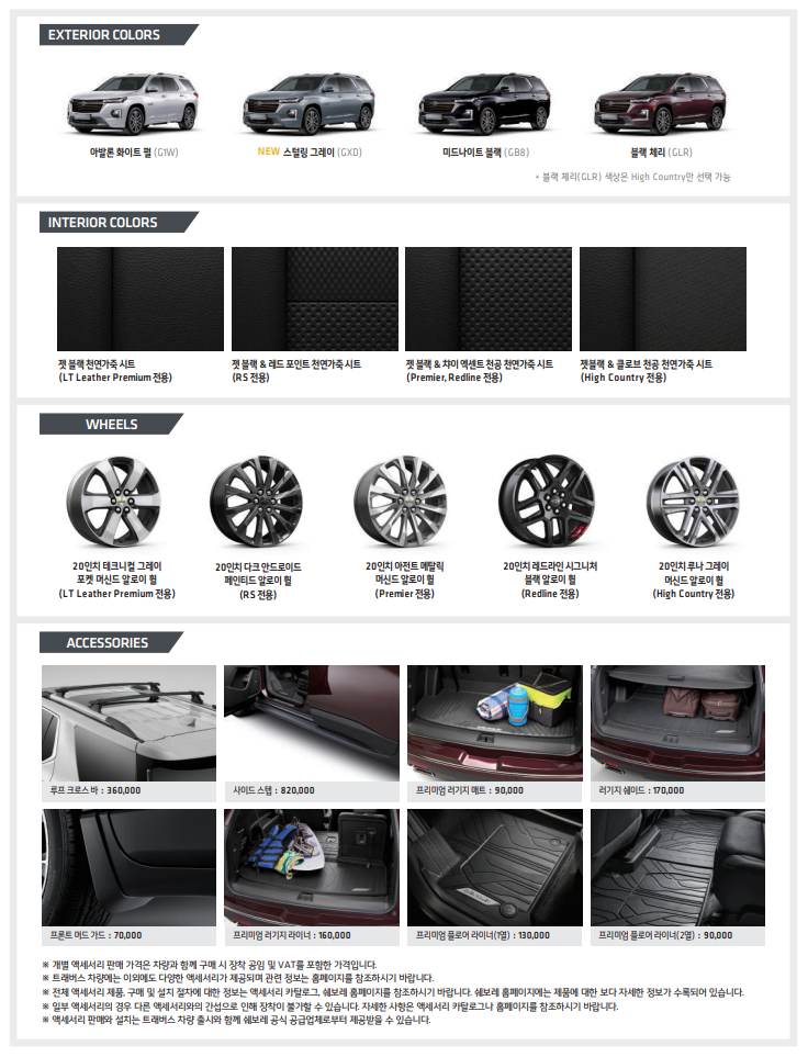 트레버스의 판매가격은 5640만 원~6615만 원으로 책정이 되었는데요. 트림에 따라서 가격의 차이가 있으니 자세한 가격은 아래의 가격표 옵션을 참고하시면 도움이 될 것 같네요.