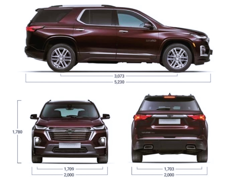 2023 쉐보레 트래버스의 크기 제원은 전장 5230mm, 전폭 2000mm, 전고 1780mm, 휠베이스 3073mm의 크기를 가지고 있으며, 차량의 공차 중량은 2090kg의 무게를 가지고 있는 준대형 SUV 모델이에요.