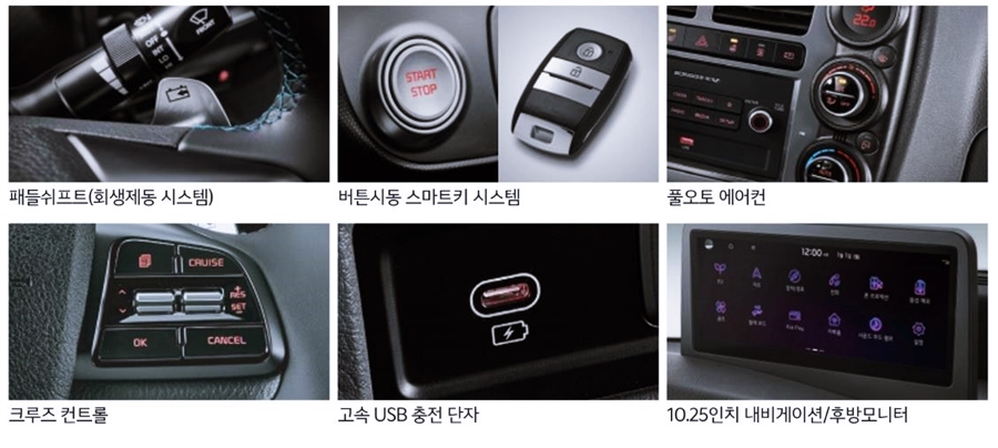 봉고3 EV 모델의 경우 그냥 화물 트럭이 아닌, 최신 화물 트럭이라는 생각이 드는데요. 최신 사양답게 각종 편의기능을 제공하고 있어요. 패들쉬프트, 버튼시동 스마트키, 풀오토에어컨, 크루즈 컨트롤, 고속 USB 충전 단자, 10.25인치 내비게이션 등 요즘 나오는 옵션들은 거의 갖추고 있기 때문에 편의성에서 매우 높아졌어요.