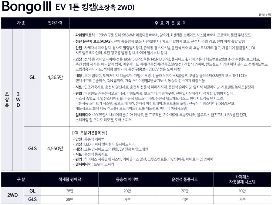 봉고3 EV 가격표