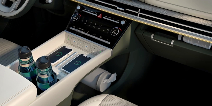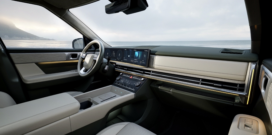싼타페 풀체인지에는 파노라믹 커브드 디스플레이와 듀얼 스마트폰 무선 충전 시스템 등을 적용하여 더욱 편리한 자동차를 만나보실 수 있는데요. 또한, 친환경 재료를 사용하여 더욱 우리에게 친근한 자동차 실내 모습을 만들어 줬어요.