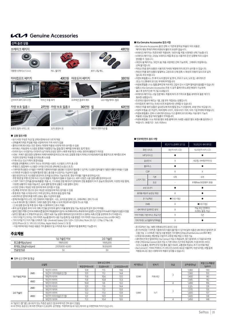 셀토스의 파워트레인은 2가지 파워트레인을 가지고 나왔는데요. 2.0리터 가솔린 엔진의 경우 4 기통 자연흡기 가솔린 엔진과 CVT 변속기의 조합으로 최고출력 149마력 / 최대토크 18.3kg.m의 성능을 발휘하고 있어요. 복합연비는 12.3~12.9km/l의 연료 효율성을 보여주네요. 그리고 많은 판매량을 보여주는 1.6 가솔린 터보 엔진의 경우 4 기통 싱글터보 엔진과 자동 8단 변속기의 조합으로 최고출력 198마력 / 최대토크 27.0kg.m의 성능을 보여주고 있어요. 복합연비는 11.8~12.8km/l의 연료 효율성을 보여주고 있습니다.